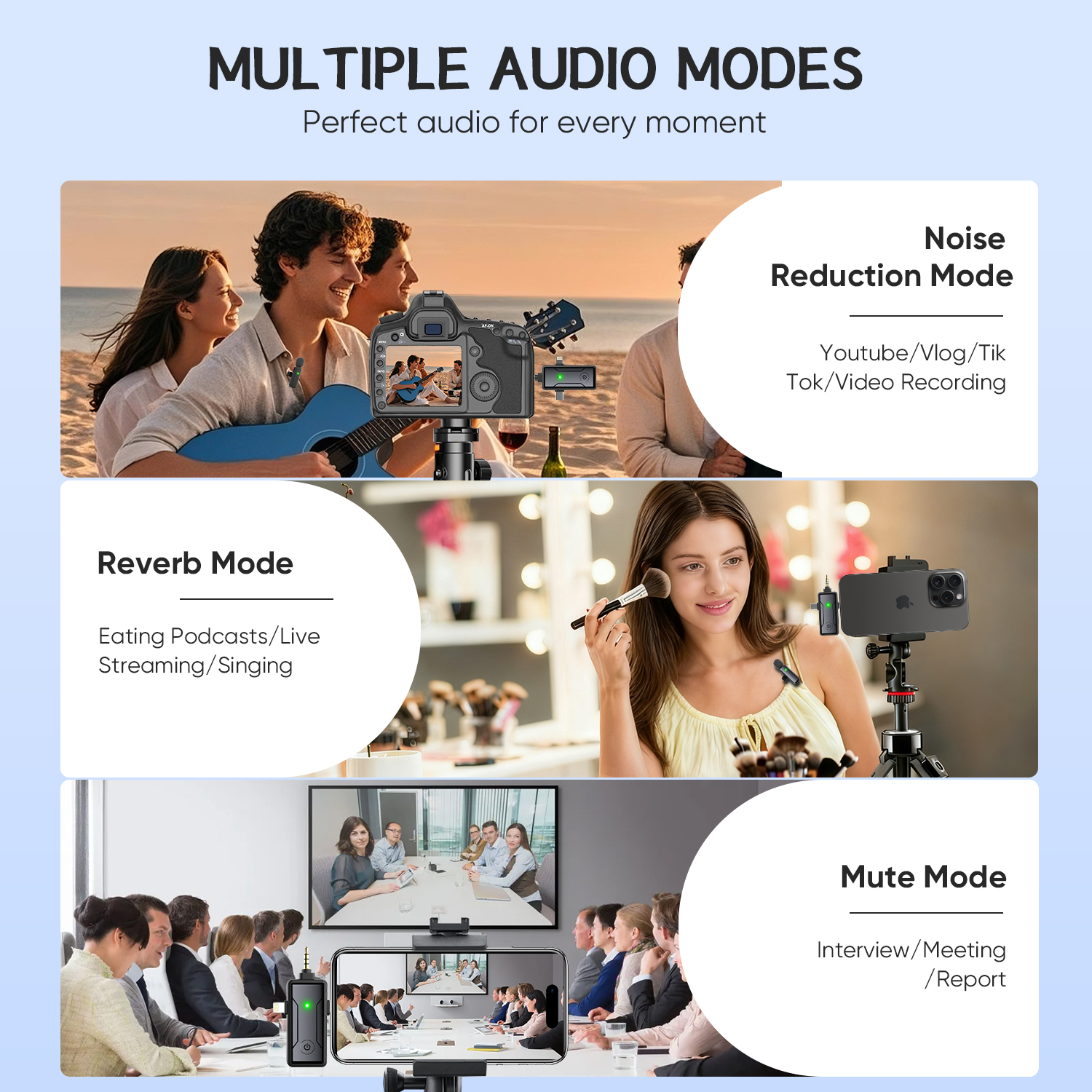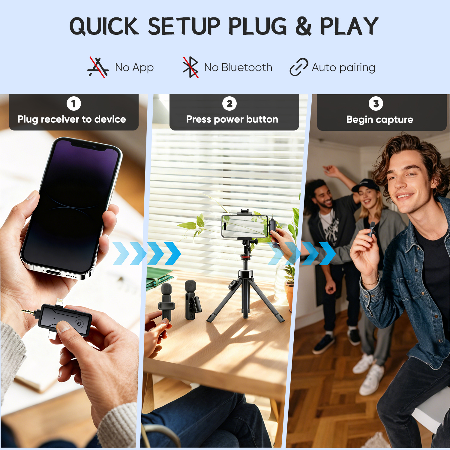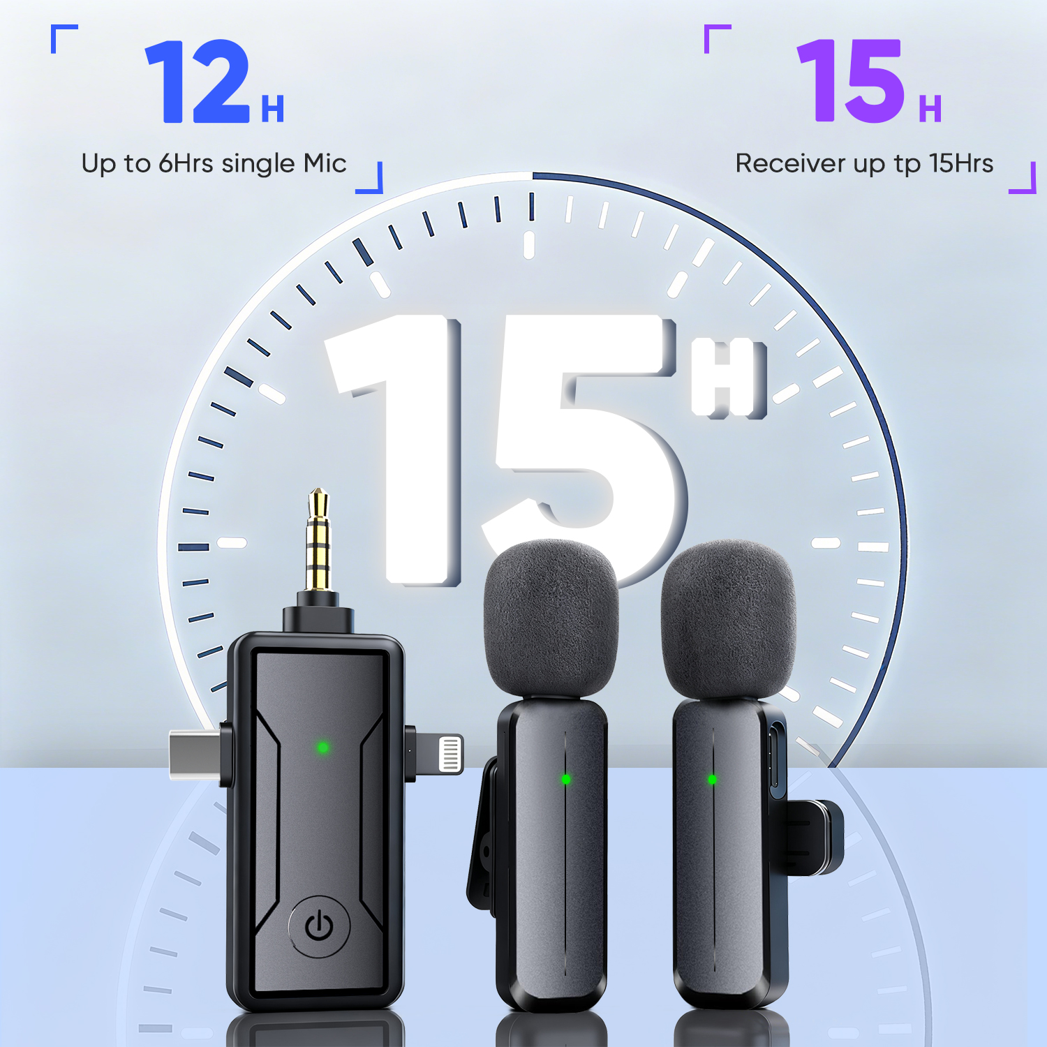3-in-1 Universal Compatibility: This wireless microphone features a 3-in-1 receiver with USB-C, Lightning, and 3.5mm plugs, allowing instant use with iPhone, iPad, Android, cameras, and laptops. No drivers or apps needed. Compact and travel-ready, it’s an ideal mini microphone for creators